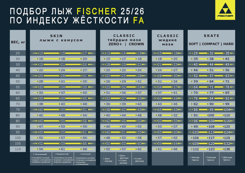Вы можете самостоятельно подобрать лыжи по жесткости в зависимости от ваших потребностей по таблице FA ниже.